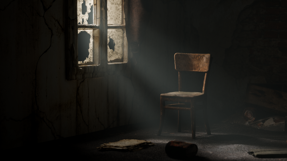 The scene is a simple abandoned room with a strong storytelling atmosphere: