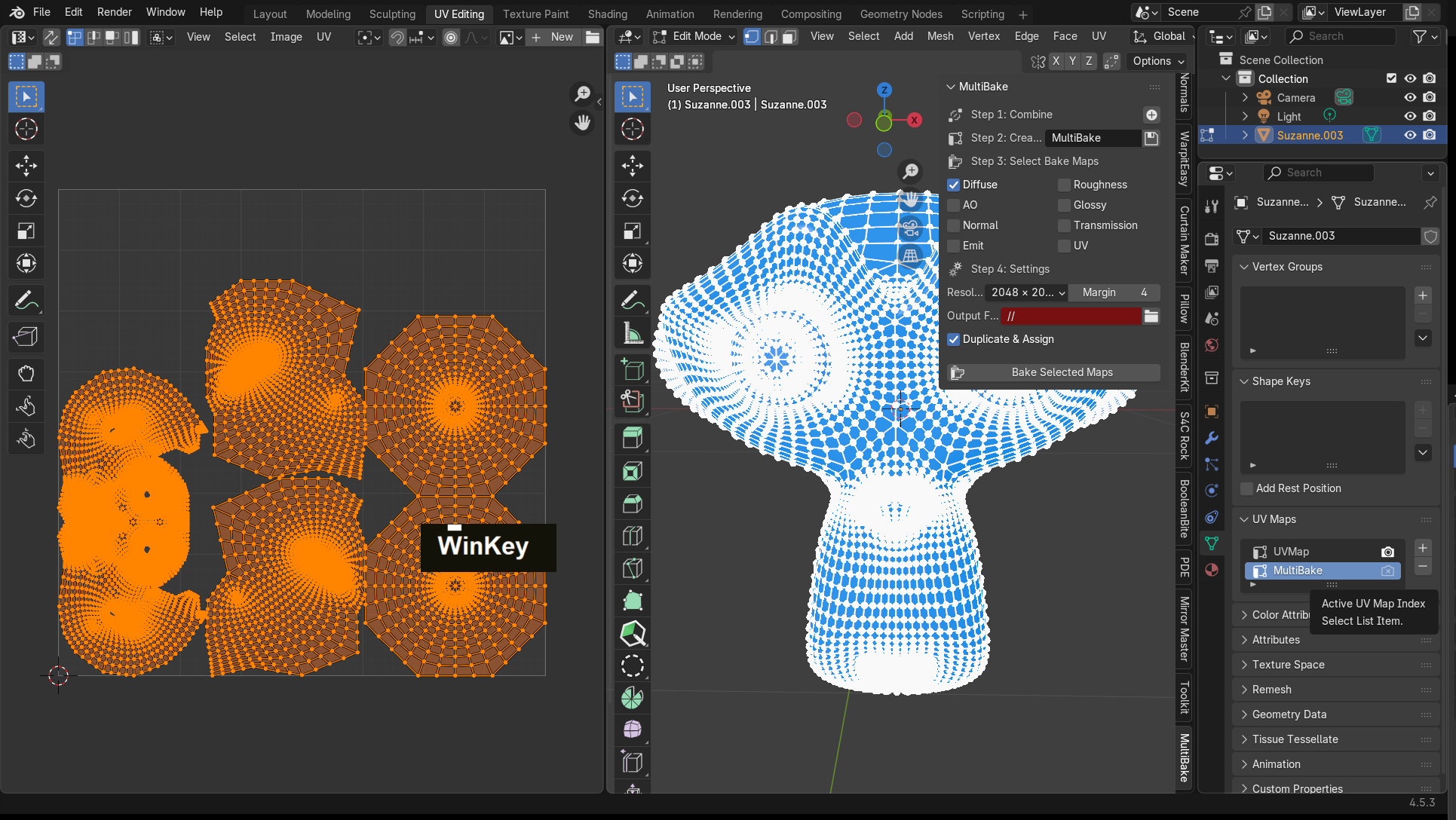 Automatically creates a new UV map called “MultiBake”, selects all UV islands, and packs them neatly into one UV space — ready for baking.